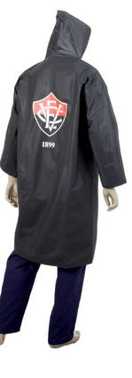 Especificações: capa de segurança com capuz, confeccionada em tela de poliéster revestida de PVC em uma das faces, fechamento frontal por meio de quatro botões plásticos de pressão e costuras por meio de solda eletrônica.